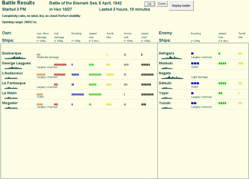 The results of all battles - between surface ships, or surface ships and submarines, or aircraft and surface ships or land targets, are reported in a summary screen.