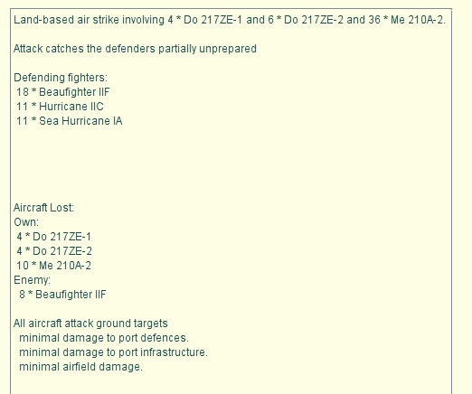 The further extract below shows a typical aerial attack on a port. The attack destroys some enemy aircraft on the ground, and also causes minor damage to port and airfield facilities: