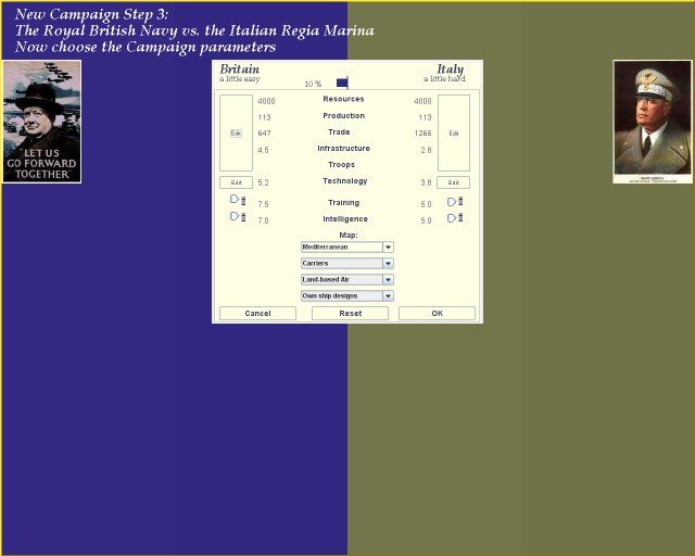 At the top of the panel, you will see the computer's evaluation of the current odds, both descriptively, and in terms of a bar that stretches right or left. For example, in the picture shown above, the computer is currently evaluating the game as "a little easy" for Britain, and conversely "a little hard" for Italy. The bar, which stretches to the left in Britain's favour, rates the advantage as 10%. This figure is important because it affects how the computer evaluates your performance during the game - as the odds against you get easier, your failures are less forgiven and your successes less praised. Conversely, your opponent's failures will be less harshly judged. In an easy or very easy game, you can quickly find your performance fails to meet expectations and you can be peremptorily sacked! In SAS WW2 you are playing not only to win the game, but to do so in a way that enhances your reputation.