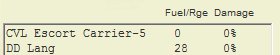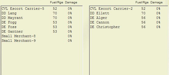 The ship list shows at a glance the damage status and bunkerage or endurance of each ship. In the example below, the hex range and degree of damage (as a percent) are shown for the carrier and one of the destroyers: