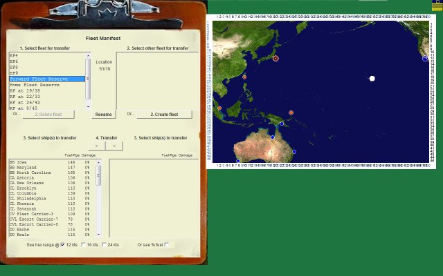 Note that if the fleet you have selected is an emergency fleet, the create fleet button will not be enabled. The reason for this is that emergency fleets are automatically created by the computer at run time, in response to things like fuel shortages, or damage. Ships in these fleets need to return to the nearest suitable port, and that is the orders that the computer has given the fleet. If you were able to move ships out of the emergency fleet, the computer at run time would just put them back again.