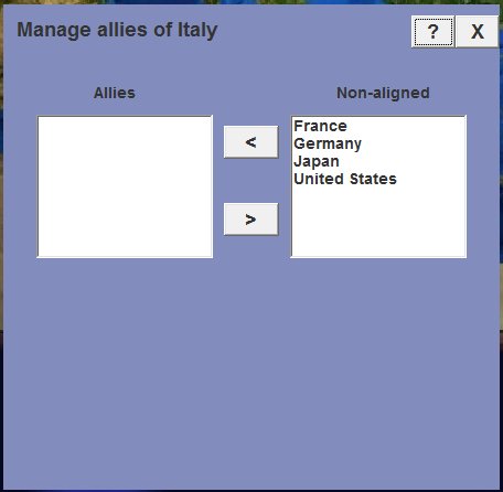 You can add to (or remove) allies for the country you are currently playing by clicking on the 'Manage allies' button. Note that the term 'allies' does NOT here imply a country with allegiance to the 'allied' cause in WW2; it is any country that has an allegiance to the country you are playing. The so-called 'axis' powers: Germany, Japan and Italy can also have 'allies' of their own. (See making alliances for general information on allies.)