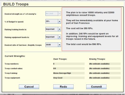 Building troops for a turn can be as simple as just one mouse click - simply accept your 2IC's plan by clicking the 'Commit' button at the lower right of the screen: