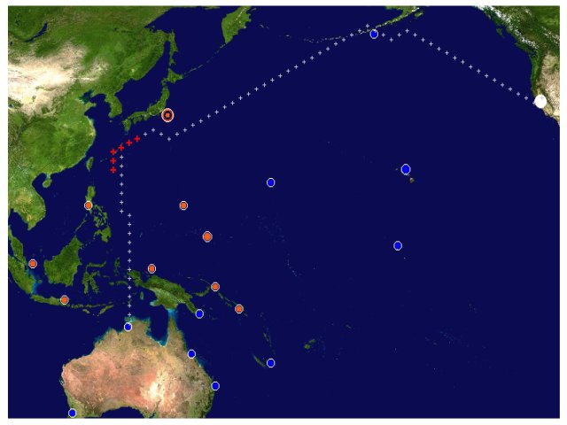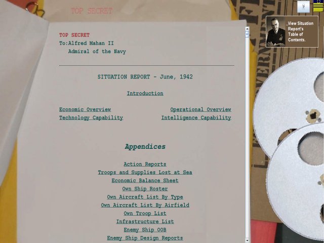 The map shows the geographic location and status of your own fleets and and known enemy fleets and ships, as well as your own and enemy troop and aircraft strengths. You can see detailed mappings of how your air power currently projects into every hex of the thetare map; and you can do the same for the enemy's air power (as known to you from your intel). You can also see your own minefields and suspected enemy minefields. And you can link to detailed information about the current orders for all of your fleets.