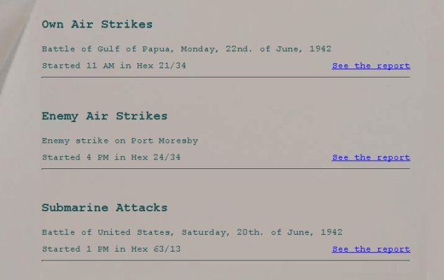 The Action Reports appendix should also have links to the other battles: two airstrikes and a submarine engagement. If it is not immediately visible, scroll through the Briefing Report until it is: