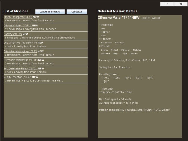 You can view the details of any of the missions, cancel any and try again, but for now, just note that that you have some convoy and troop transport missions, some offensive patrols by surface ships and subs, and some minelaying missions. The remainder of your ships are placed in 'Ready Reaction' fleets - available to steam out at short notice to intercept enemy that come close enough.