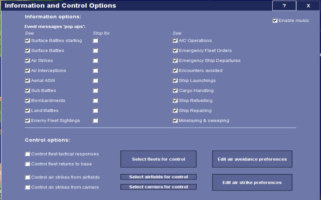 When you tick any of the four control options at the bottom of the screen, the turn calculation will stop whenever necessary - in response to updated intelligence of the enemy - to show you a dialog box for changing tactical response or retrun to base orders for your fleets, or for aborting or amending planned air strikes.