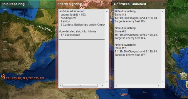 Also new to ver1.1 is an information feature that lets you see mappings of your own air power, or the enemy's, across the whole map and from selected airfields and carriers.