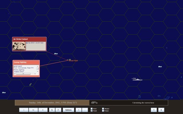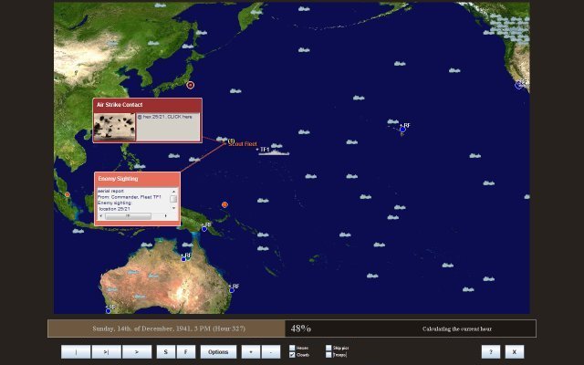When the calculation is paused, you can also review up to date information - as at that hour- on all your fleets and enemy fleets, and for the selected fleet change its rules of engagement, tactical responses and air strike targets. You can also also re-plot its movement path and issue new orders like bombard, lay mines, load and unload etc!