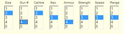 The design factors are relative factors. For example, a "Calibre" factor of 2 for a size 2 battleship means something different for a size 3 battleship, or of course, for a cruiser or escort of any size.